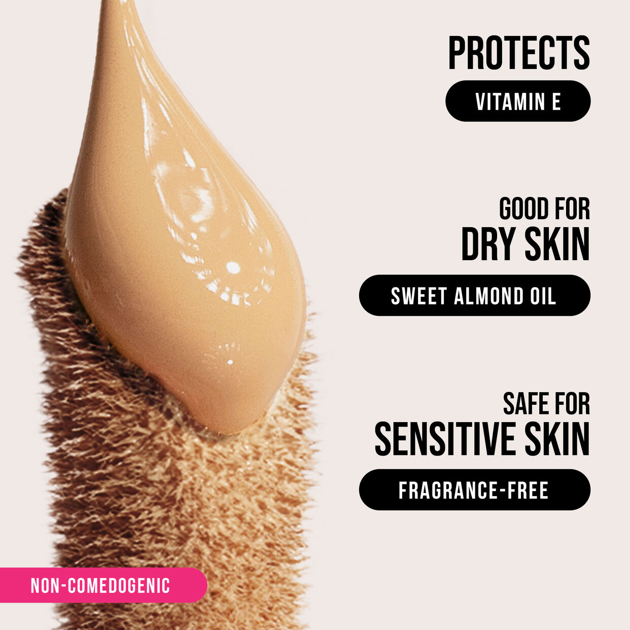 Vegan-friendly, fragrance-free, alcohol-free, waterproof, sweat-proof, transfer-proof, non-comedogenic, packaging is made with 30% PCR material, outer pack is FSC certified & recyclable.