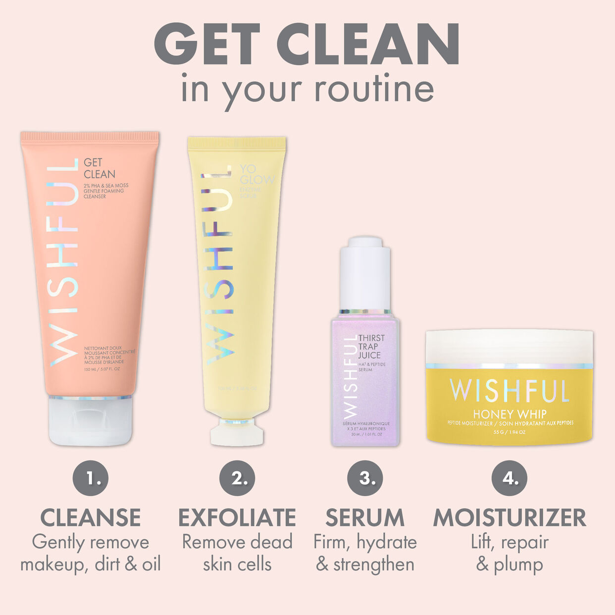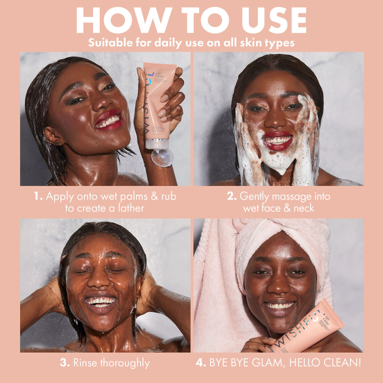 Get Clean is a hardworking cleanser that is gentle and skin-loving enough for even the most sensitive skin. 2% Gluconic Acid (PHA) gently exfoliates the skin while Sea Moss helps retain moisture leaving the complexion refreshed and supple. Get Clean is packed with Coconut & Amino Acid Derived Surfactants that melt away makeup while Salicylic Acid & Willow Bark work to unclog pores without stripping the skin. To turn Get Clean’s gel formula into a rich, creamy, makeup melting foam, add a little water and massage into skin.