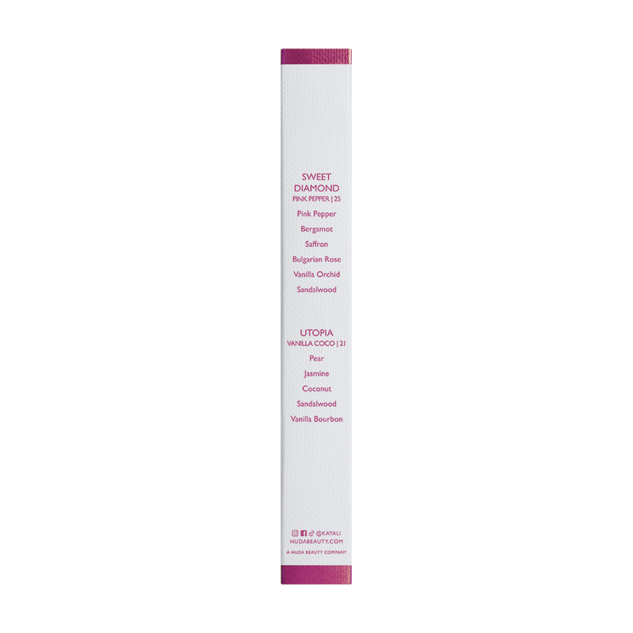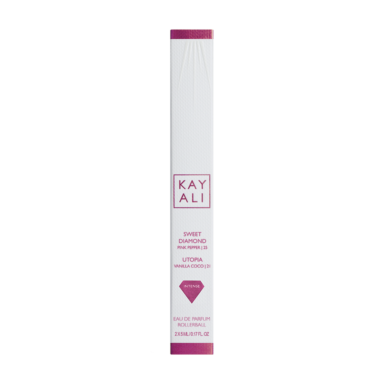 This captivating duo features Kayali Sweet Diamond Pink Pepper | 25 and Utopia Vanilla Coco, the perfect blend of sweet and spicy notes.